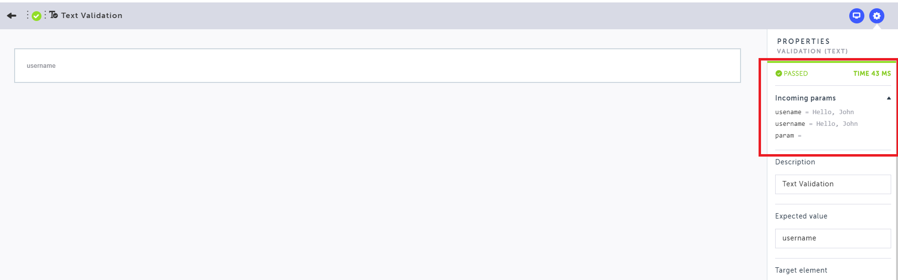 You can also use parameters, which were defined in the test or suite level or were defined in the config file to validate the text element. If you use a parameter that was created in a different step, you will have to export it to the test level (more about exporting parameters).