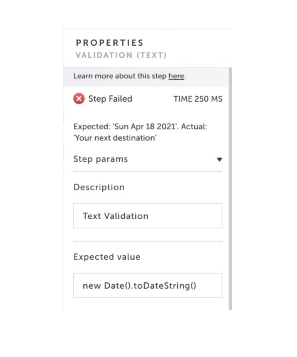 In some cases, you may want to validate that a text equals the result of a JavaScript expression. For example, making sure that the the text holds the current date. In this case you can set the Expected Value to this simple expression: new Date().toDateString(), and Testim will compare the calculated string result of this expression. See a failed validation:
