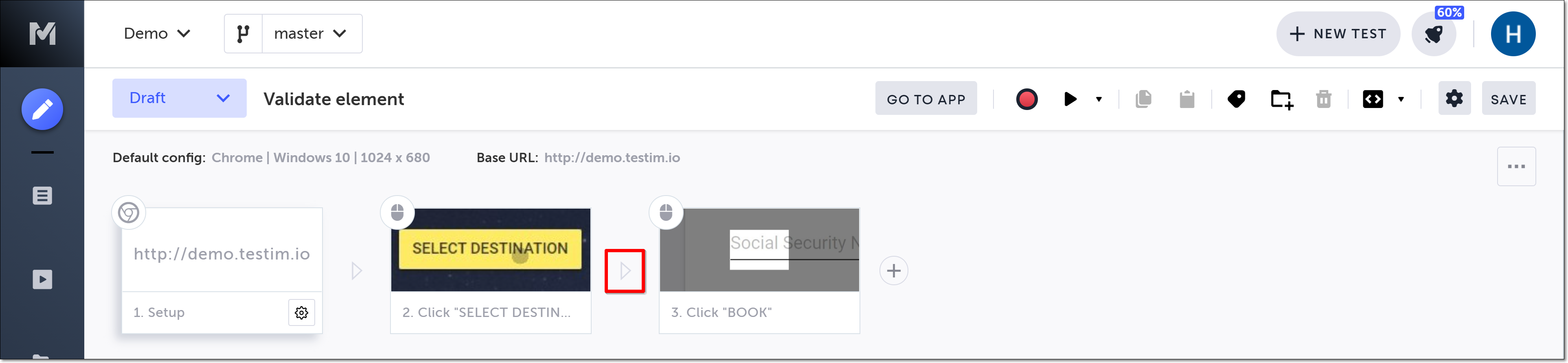 Hover over the :fa-caret-right: (arrow symbol) again and click on the “M” (Testim predefined steps).