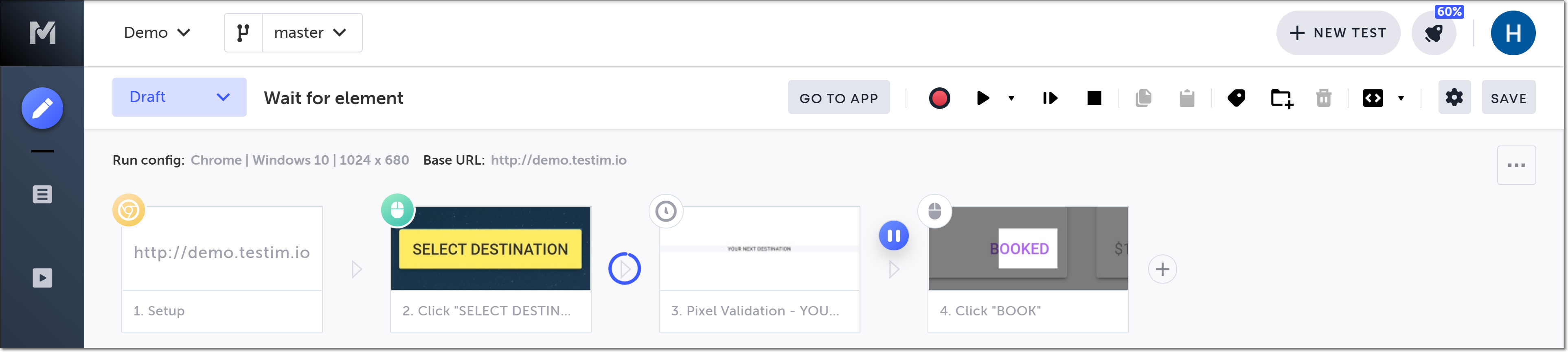 A Wait For step allows you to force your test to pause and wait for a certain event to occur before moving to the next step. In the case of a Wait for element visualization step, Testim waits for the element to be visible on the page and then validates the element on a visual level. The visual validation and wait-for steps allow you to compare visual differences between your baseline and your current test run with precision. You can modify several parameters to customize the comparison method between the baseline and the test. This functionality is provided as a service by Applitools, and requires integration with their Applitools Eyes app.