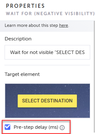 In some cases, you want to set a delay time before checking that the element is not visible. For example, you want to make sure that the element does not suddenly appear on the page. → To add a delay to a Wait for Element Not Visible Step: