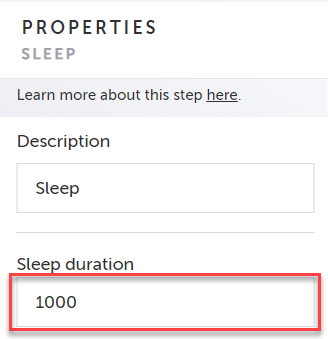 The default sleep duration is 1 second (1,000ms). To update the sleep duration click the step properties and edit the milliseconds value.