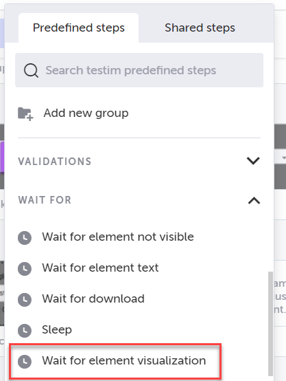 Use wait for element visualization to wait for your element to be visible on the page and validate its expected visualization. See Visual Validation for more information. → To add a Wait for element visualization step: