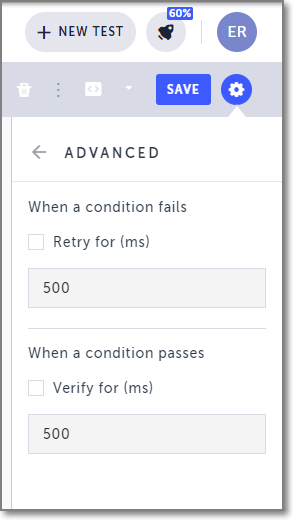 If a condition for a step or loop is false, the default action is to skip the step or end the loop immediately. Alternatively, if a condition for a step or loop is true, the default action is to immediately execute the step or repeat the loop. Use the advanced options below if you want the system to continue checking the condition for a specific amount of time before declaring it to be true or false.