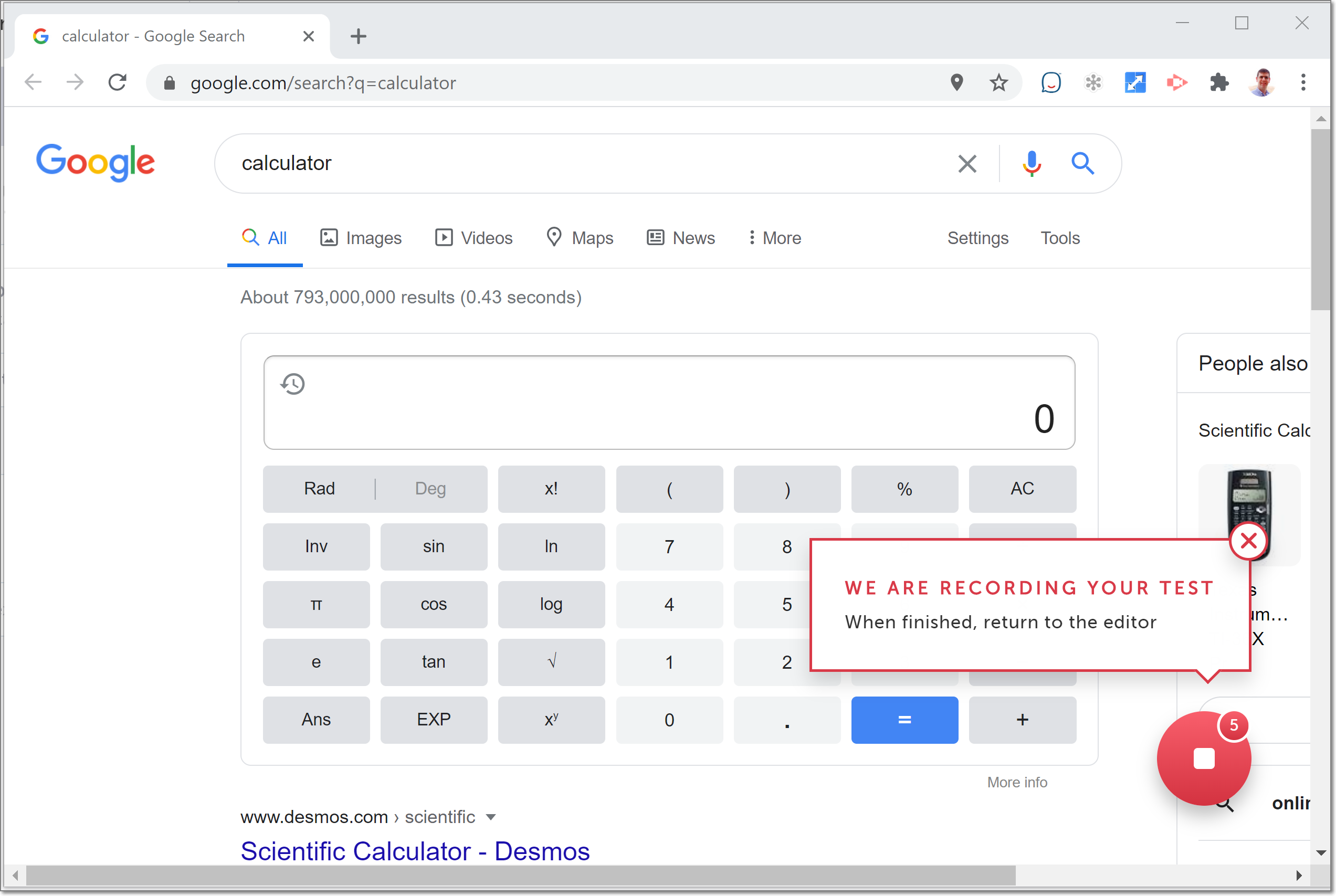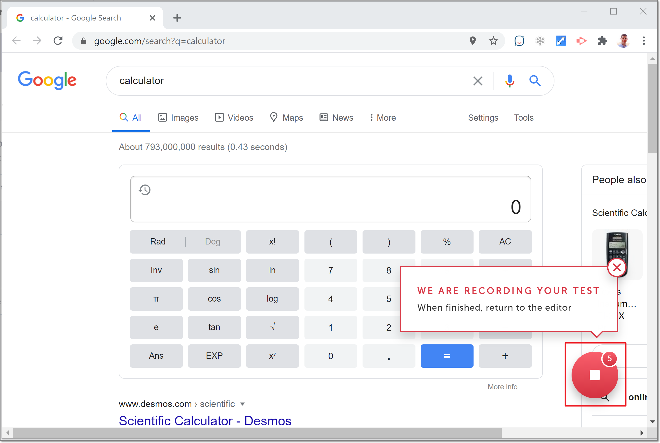 The AUT browser opens with a message that your test is being recorded.