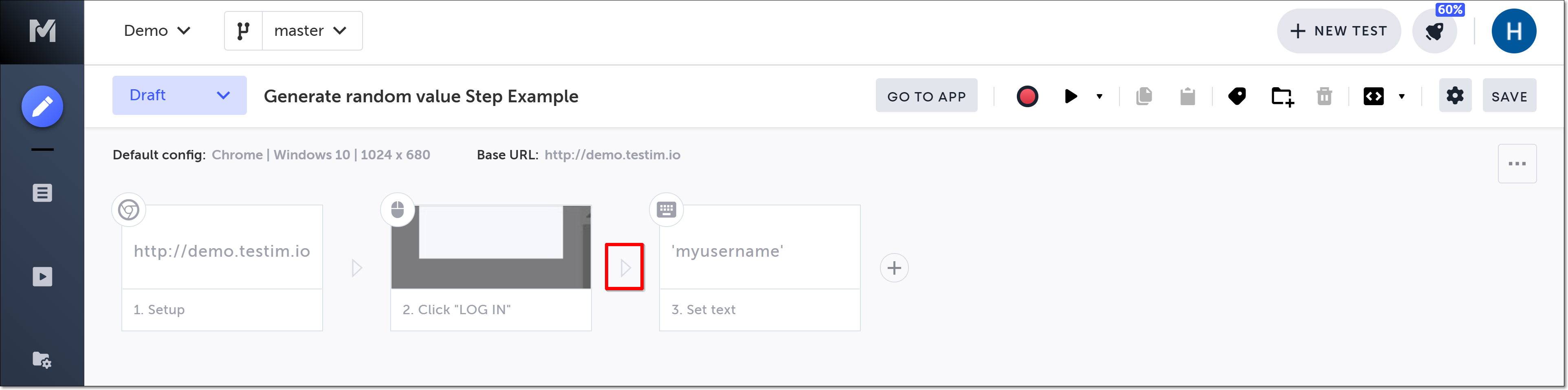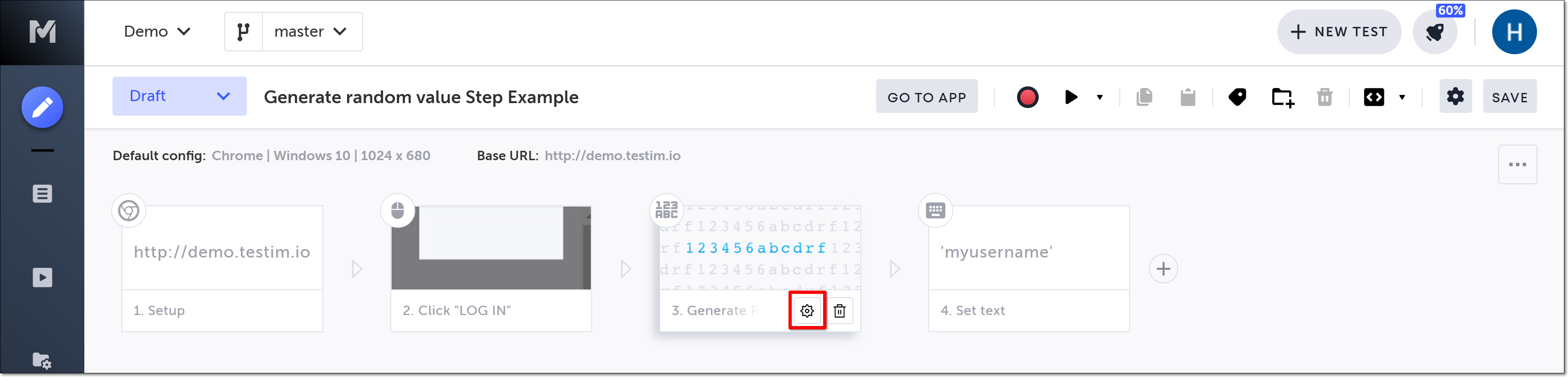 Being able to generate random data for testing enables you to extend coverage without needing to create additional tests, find failed cases within specification, enable distribution of sets of data, and ensure that you're not using the same data over and over in your tests. → To generate a random value using a “Generate random value” step: