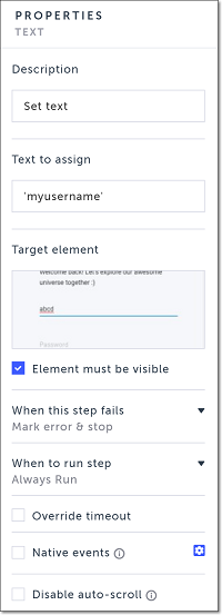 When the test is run, the generated random value (along with the optional prefix and suffix) is stored in the designated variable. → To modify your “Set text” step to set random text: