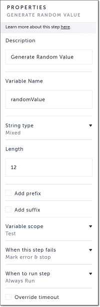 Click here to open a sample test which includes several Generate random value steps. Try running the test and practice adjusting the configuration.