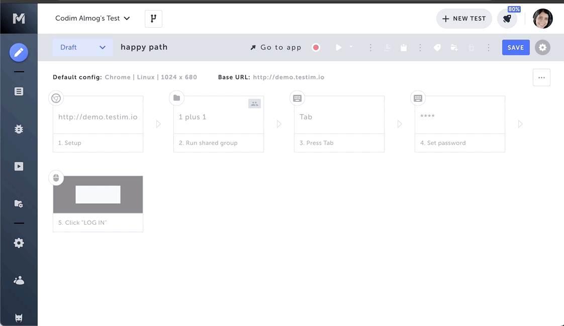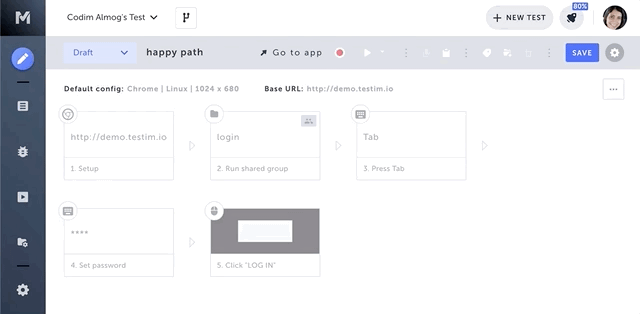 If the step expects you to pass parameters, don't forget to assign them by editing the param values (to learn more, see Parameters section). Each step passes its own parameters (e.g. you could call the "login" with "David" as params in one test, and with "John" in another).