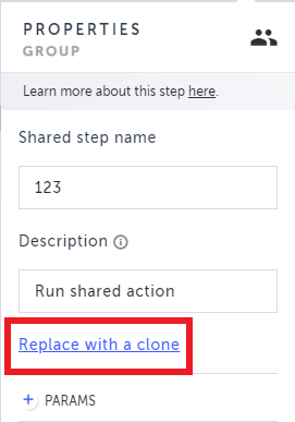 Changing shared group in one place will change it in all instances of the branch. Although you can send different parameters to different instances of the shared group, sometimes you need to make changes only in a specific instance (i.e. in a specific test). For this purpose, you will want to clone the group. → To clone a group