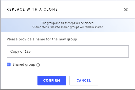 The group and all its steps will be cloned. Shared steps and nested steps will remain shared.