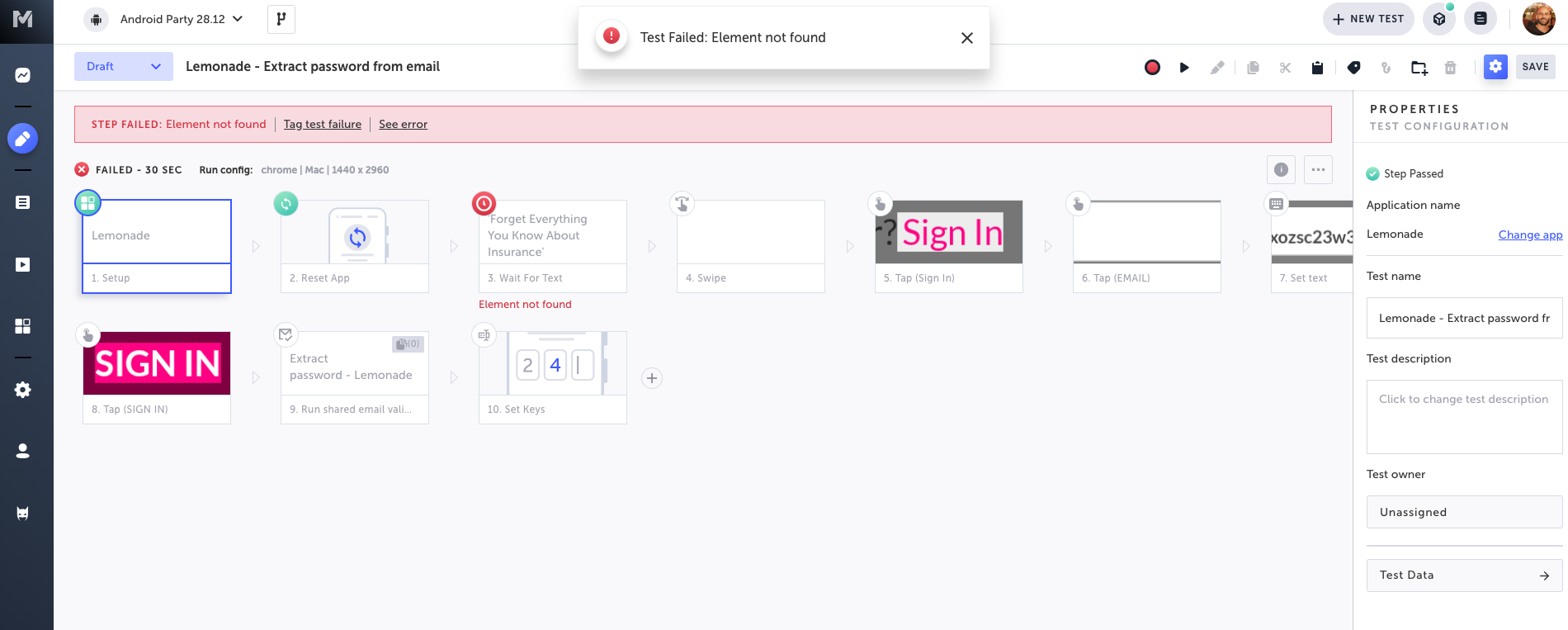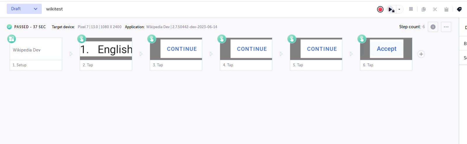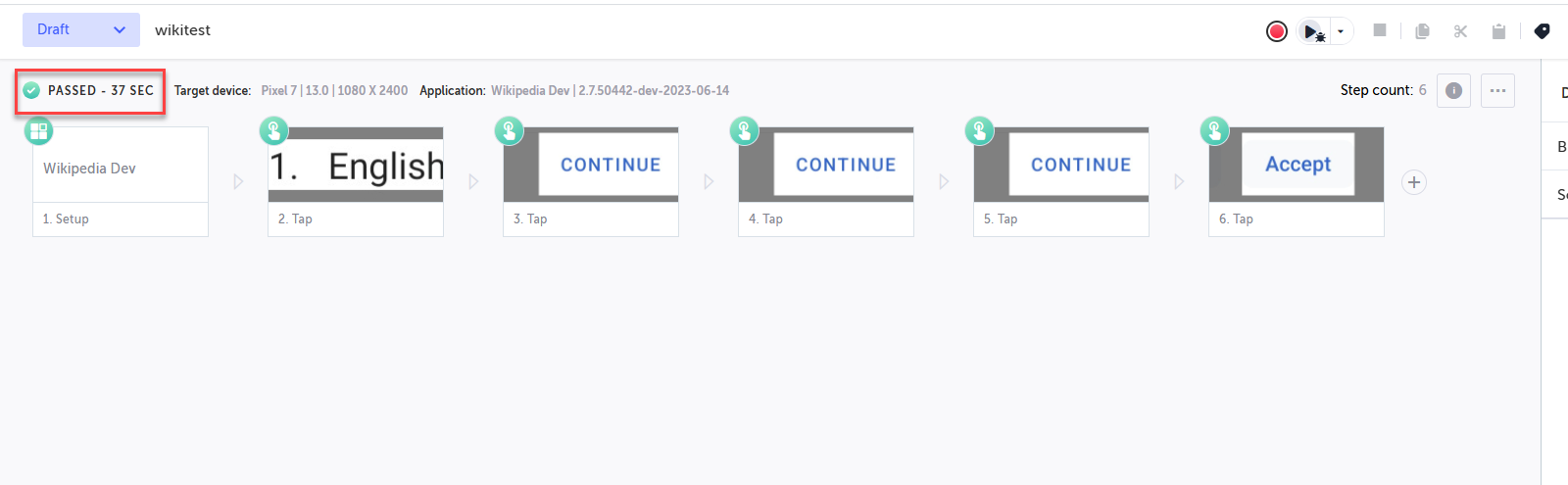 On the Test Editor screen, you can view the test results. The test result (Passed or Failed) is displayed at the top of the test. In addition, the colored icons at the top of each step indicate whether or not that action was successful.