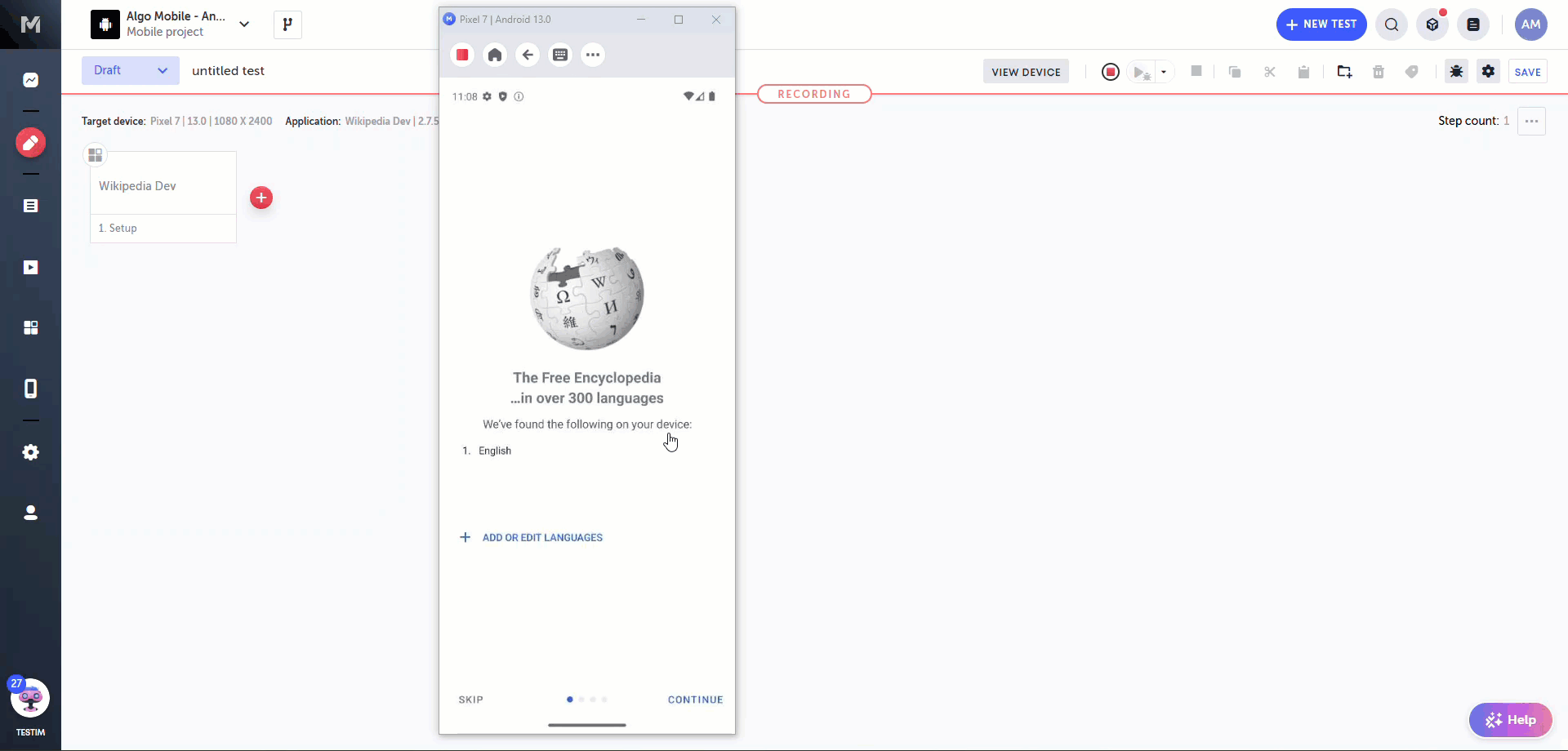 An AUT (Application Under Test) Mirroring Viewer is displayed with the opened application under test. The viewer allows you to view the device and interact with the application under test, while Testim records the actions.
