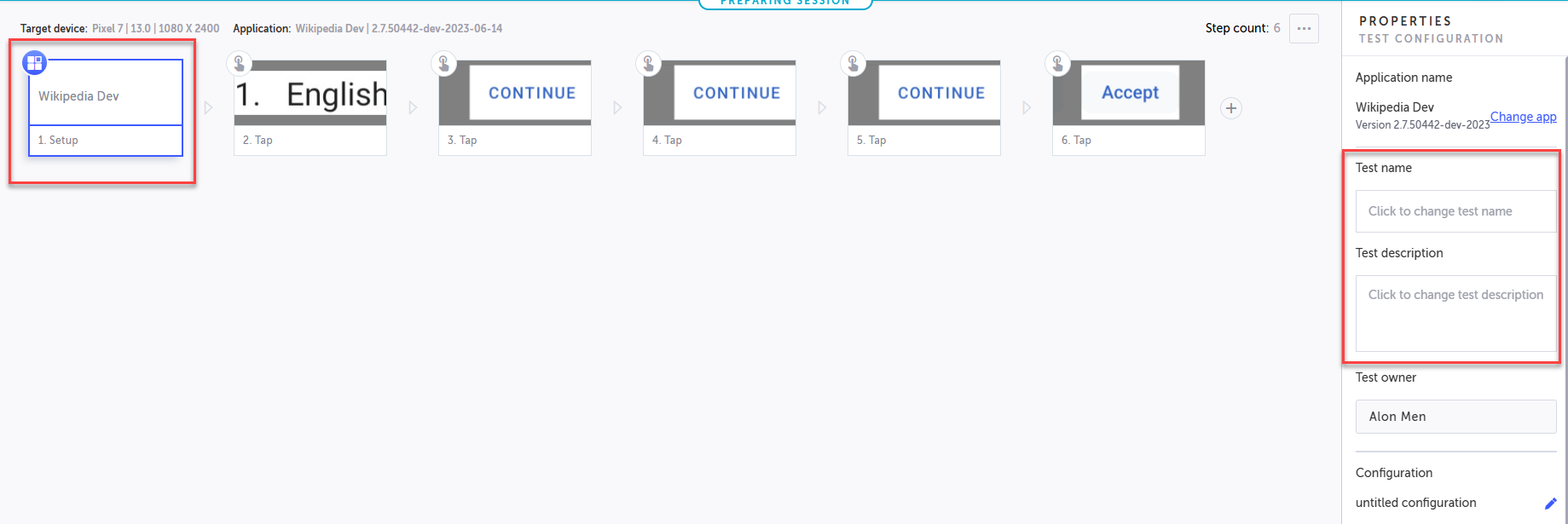 Select an Application to be tested. In this tutorial we will test the Wikipedia app from the Demo App category. Click Demo App and then navigate and select the desired application. Click Done to finish.