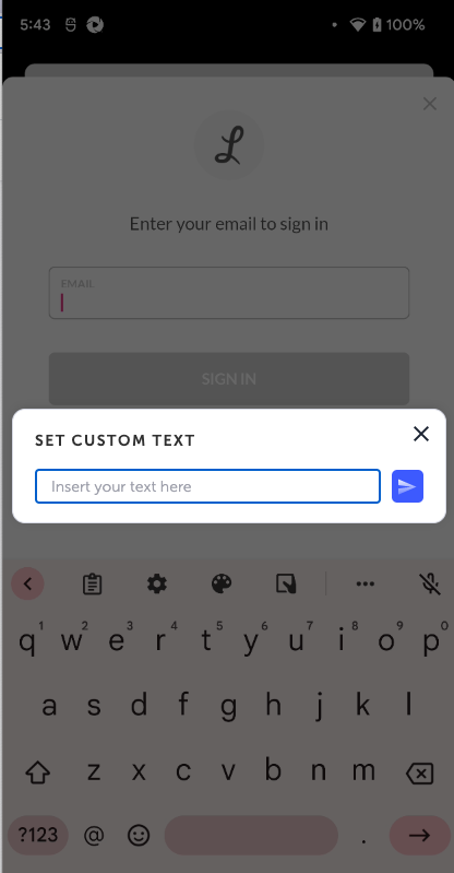 Set Custom Text - simulates a user entering text into a text field in the app. When hovering your mouse on a text element, the element is highlighted in red. Clicking the text element open a Set Custom Text window. Enter the desired text in the field and click the Send button.