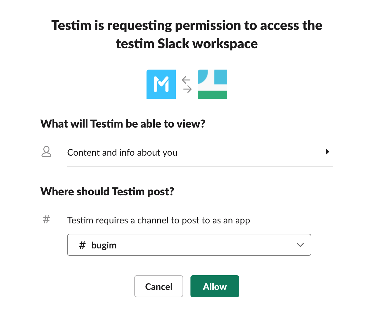 Testim can publish a bug description in a designated Slack channel, which includes detailed description of the bug, including the steps to reproduce the bug, screen resolution and browser, and a screenshot of the bug. To connect Testim to Slack you will have to provide Testim with access permissions as described below. Before you proceed, make sure you check our privacy policy to learn how we work with your data.