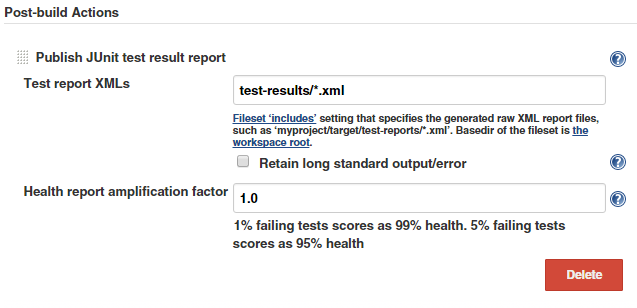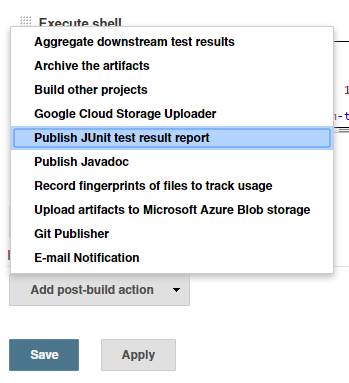 In order for Jenkins to store, analyze and show the results, we generate a standard JUnitXMLReporter XML file. For Jenkins to use the file you need to add a post-build action of type "Publish JUnit test result report":