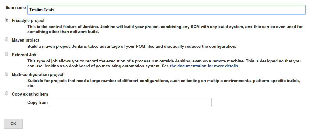 Enter job name (e.g. "Testim Tests"), and choose "Freestyle project" and click "OK":