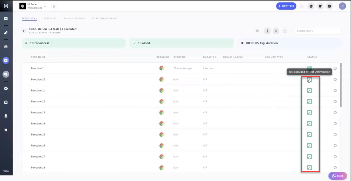 In the Execution Runs Screen, you can view the executed tests list. Under the Status column, you will see an indicator of tests that the test was excluded by Test Optimization.