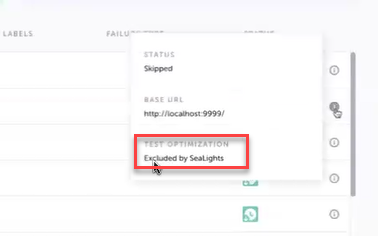 Hovering over the i icon reveals a notice that the test was excluded by Sealights.
