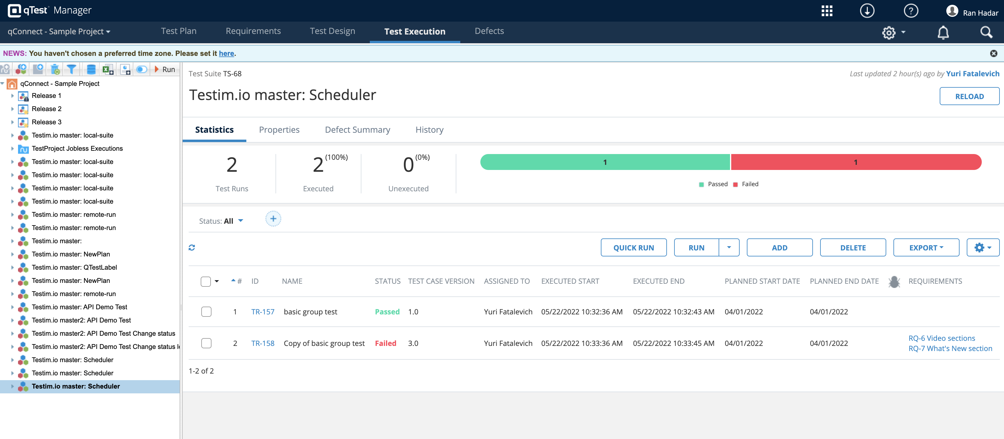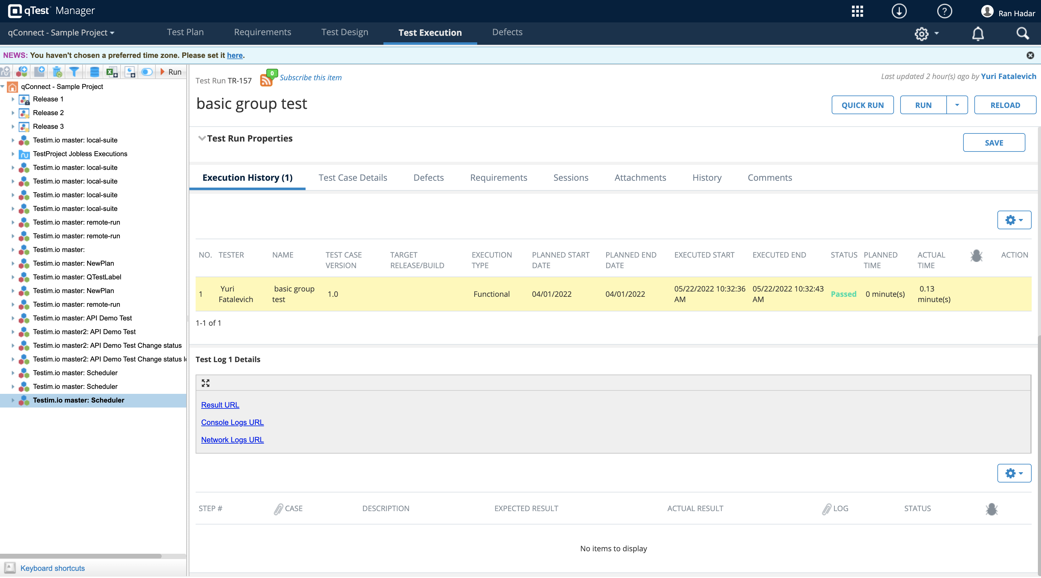 Running a test and viewing the Testim test results in qTest