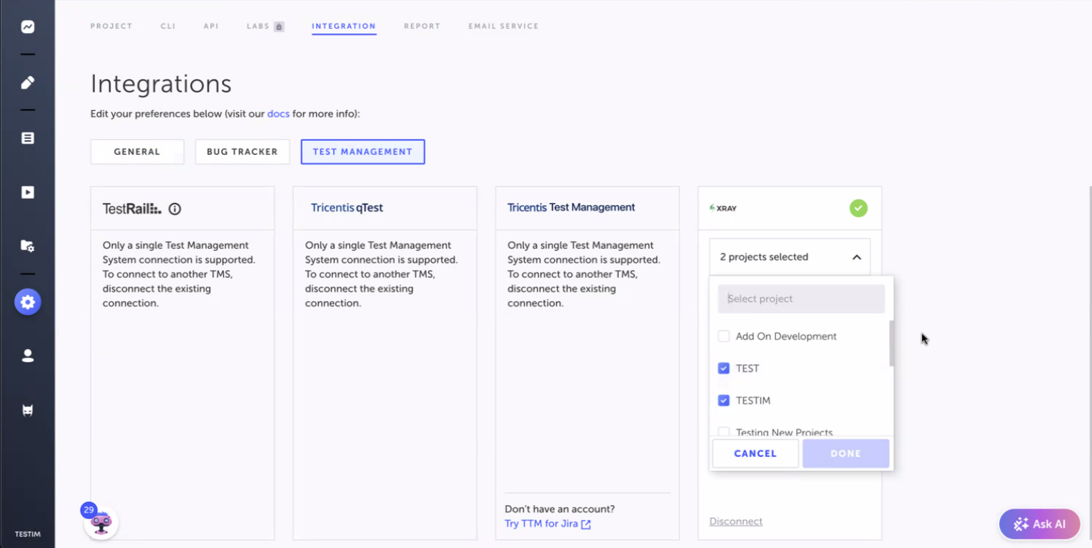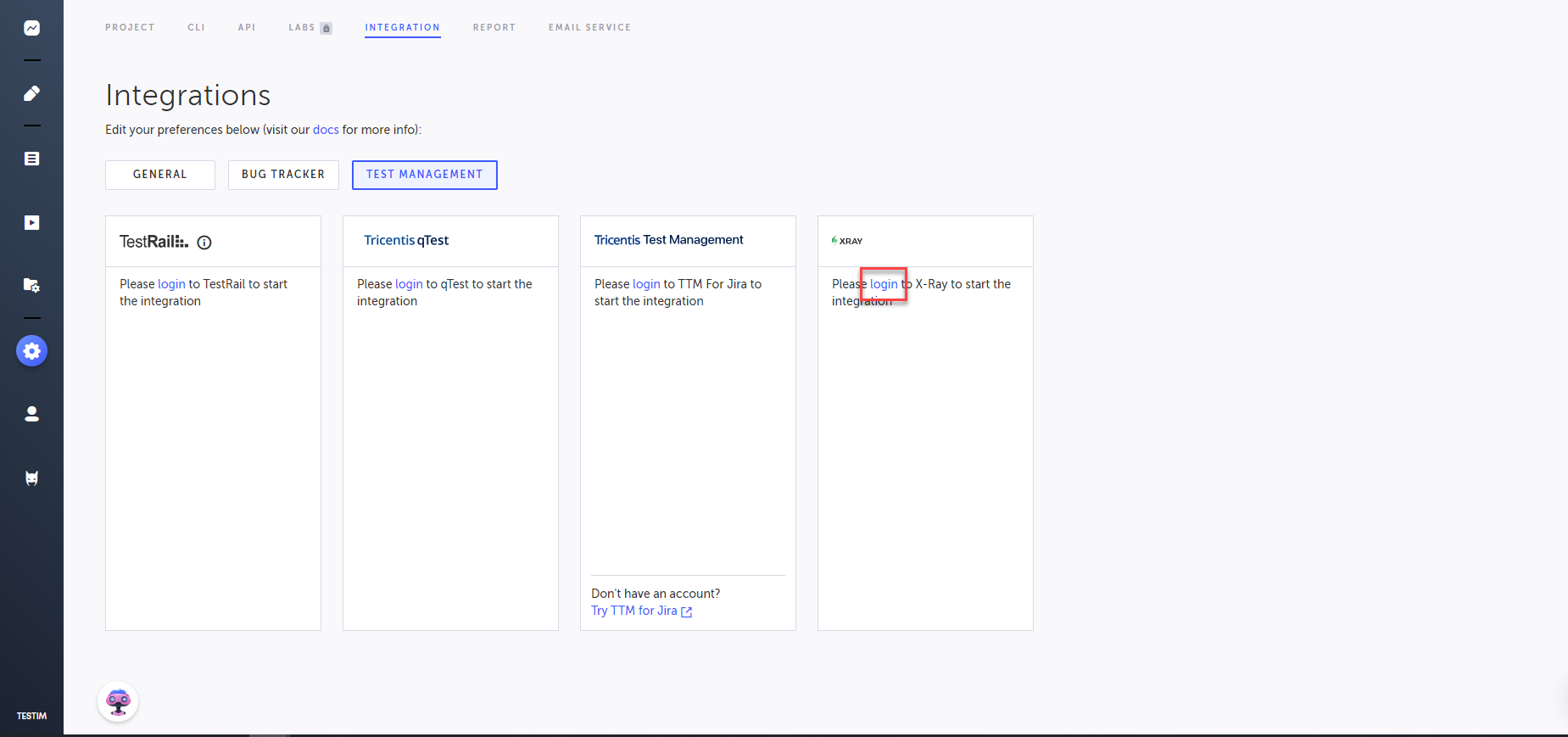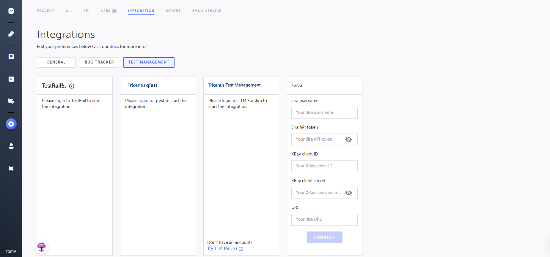 Go to Settings > Integrations tab. Under Test Management you will find various integration