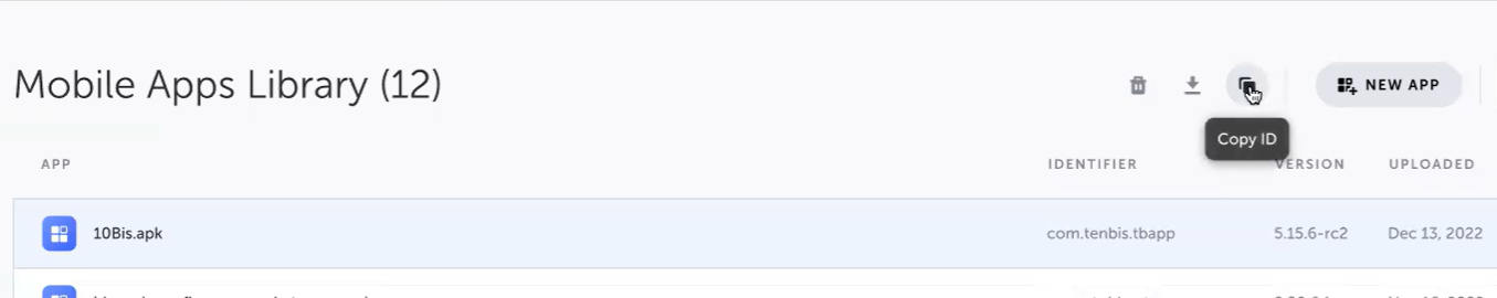 If you want to use a mobile app that is included in the Mobile App library to run tests on the grid and the app is not yet installed on this grid, you will need to copy the Mobile App ID in order to provide it to the grid through the CLI. For more information, see Running mobile tests through the CLI → To copy the mobile app ID: