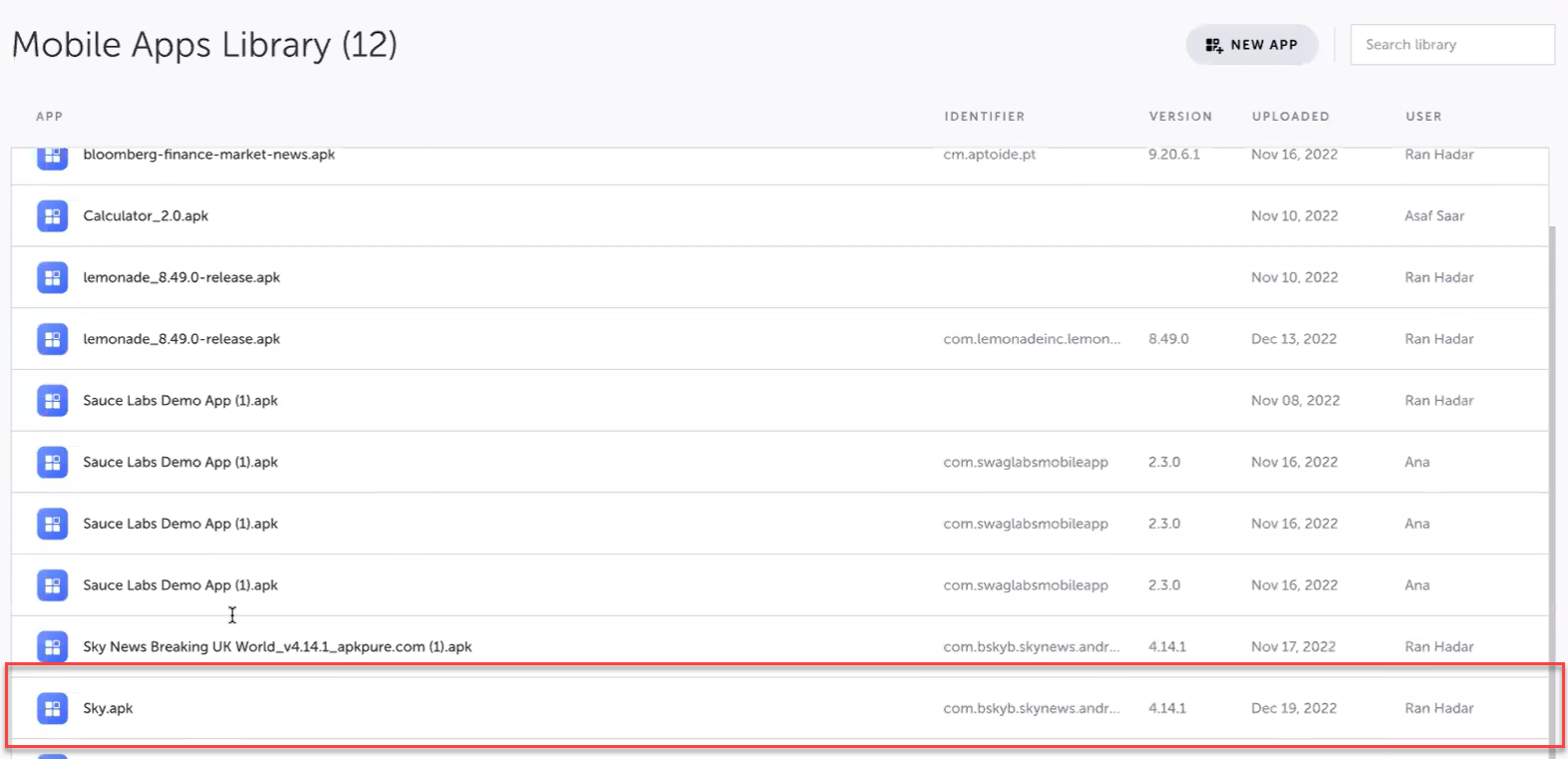 The Mobile Apps Library contains a list of all apps that have been uploaded. The following information is displayed for each app in the Mobile Apps Library: