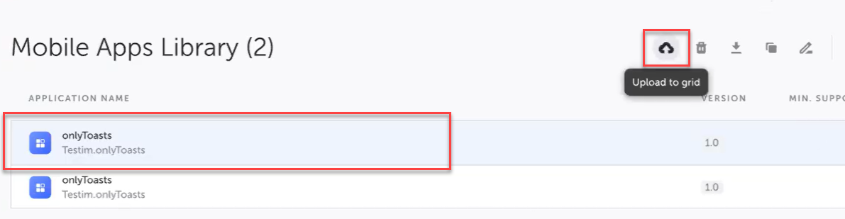Any mobile apps that have been uploaded to the Testim Mobile Apps Library can be manually uploaded to the Grid provider app storage. This allows you to run your application on the grid without having to wait until Testim loads the application to the Grid when running the test. → To upload a mobile app directly to a grid provider: