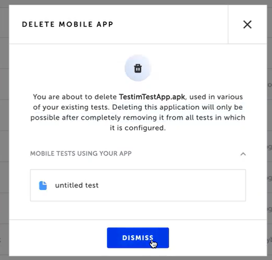 If a mobile app is used in a test, it cannot be deleted. You must remove the application from all tests or delete all tests that use the application before the app can be deleted.