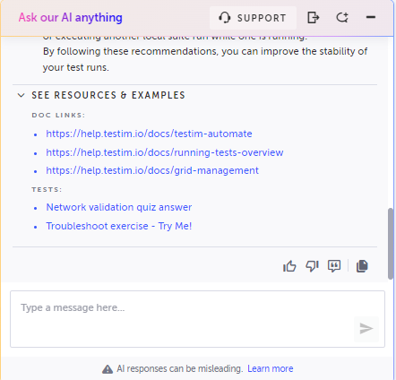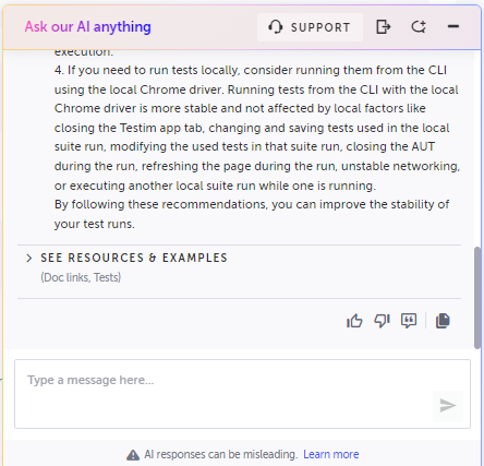 Testim Copilot Help Assistant feature uses generative AI technology to assist users on how to use the software. You can ask questions (using prompts) and receive relevant help information in response. The answers will include the following elements: • A concise summary