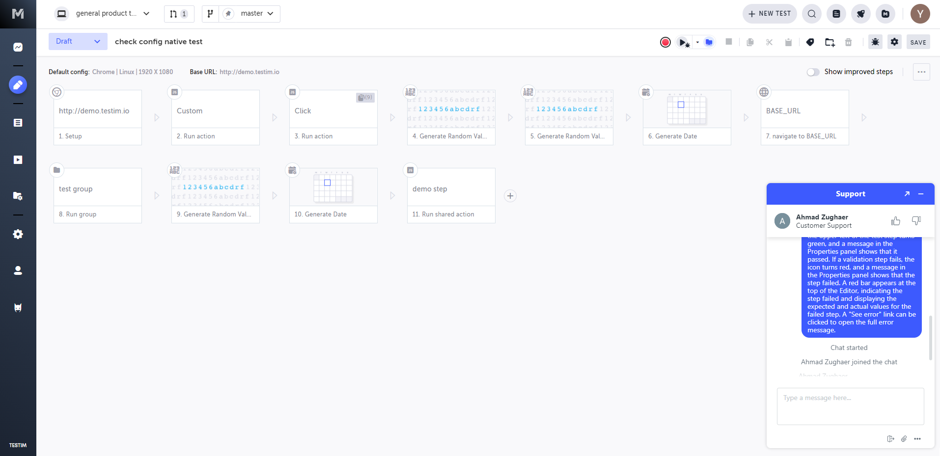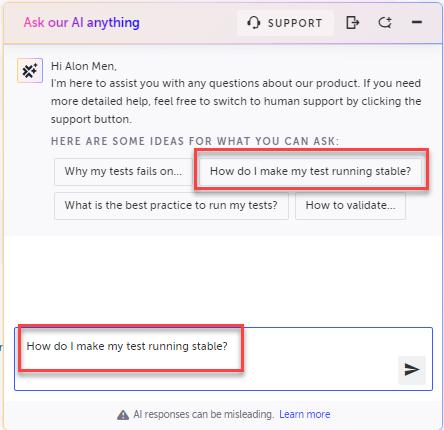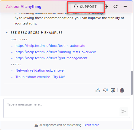 At the top of the Testim help assistance window, click the Support button. Upon clicking the support button, you will initiate a chat with a member of the support team.