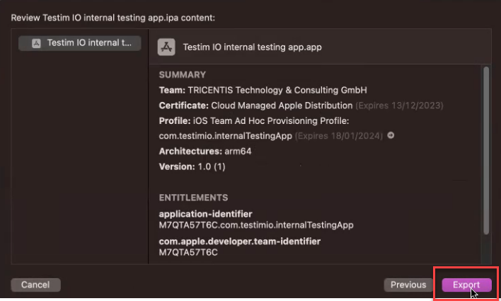 Review the app content and click the Export button and save the IPA file to your computer.