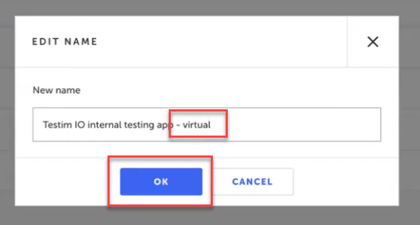 Append the app name with the term "virtual" to indicate this app build is meant for use on virtual devices. Click the OK button.