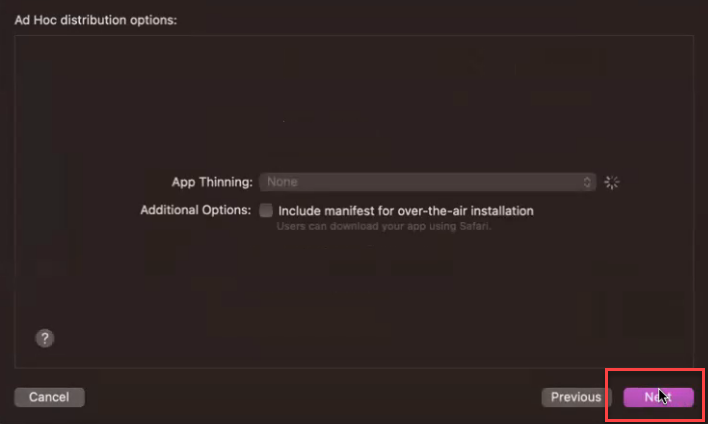 On the Ad Hoc distribution options page, click the Next button without making any changes.