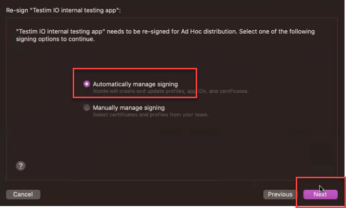 On the Re-sign page, select Automatically manage signing and click the Next button.