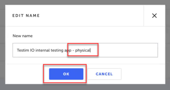 Append the app name with the term "physical" to indicate this app build is meant for use on virtual devices. Click the OK button.