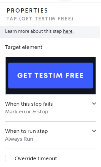 Override timeout: The “step timeout” is the time lapse (in milliseconds) which causes Testim to register a fail for a test step. The default time lapse for each step is initially set in the Setup step configuration. Selecting this checkbox allows you to override the default setting for this step and specify a different time lapse value (in milliseconds).