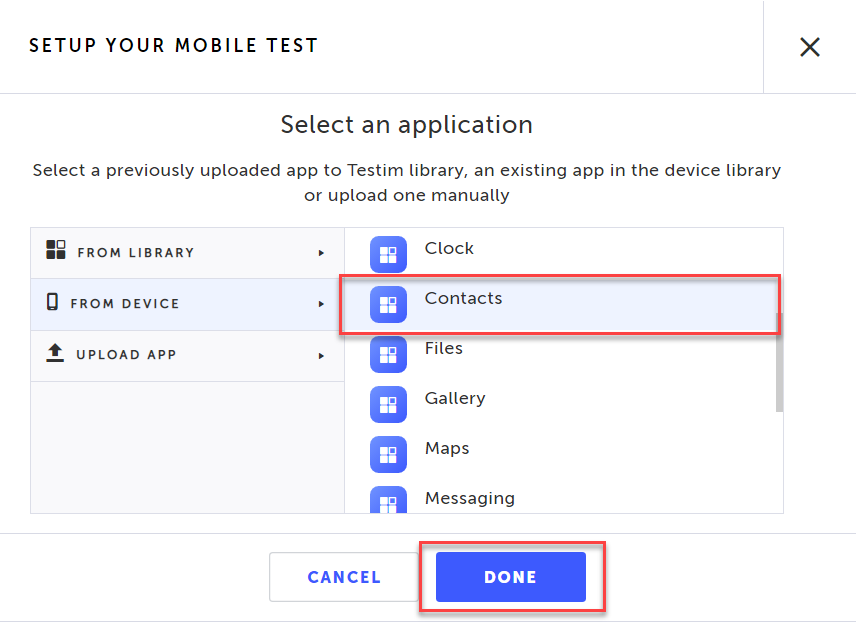 The mobile test can only test one application at a time. You can change the application being tested at any time. → To change the mobile app used for the test: