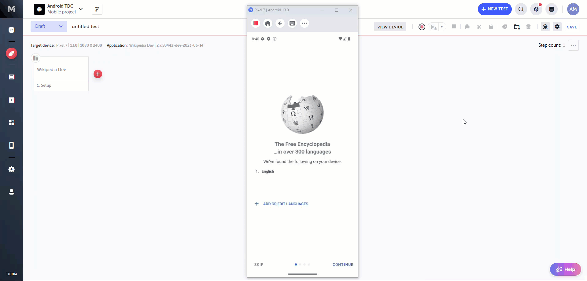 An AUT (Application Under Test) Mirroring Viewer is displayed with the opened application under test. The viewer allows you to view the device and interact with the application under test, while Testim records the actions. See Supported Mobile Actions