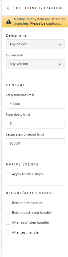 Every test has its own default configuration accessible from the property panel of the test's Setup step. The configuration parameters that are set in the test's default configuration will apply unless the test is run from the CLI or a scheduler with a different test configuration. By default an Untitled configuration is created for every new test. This default configuration includes a rule to run the test on any available device with any OS version. These settings (Device Name and OS version settings) cannot be modified, however it is possible to modify additional setting, as explained below. The modified configuration will be saved in the test itself, which means that it will not be available in the configuration library (See Configuration Library - Mobile) for use in other tests.