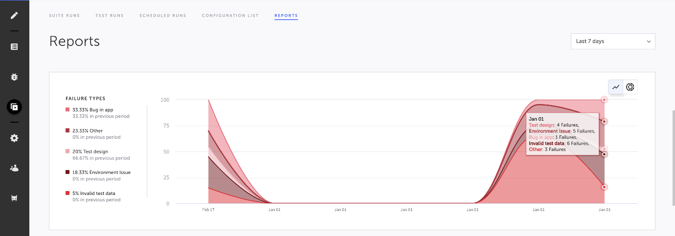 You can view statistics about failures by failure type in the reports view. As you build up data about your failures, you can identify trends, helping you target remediation or process improvement.