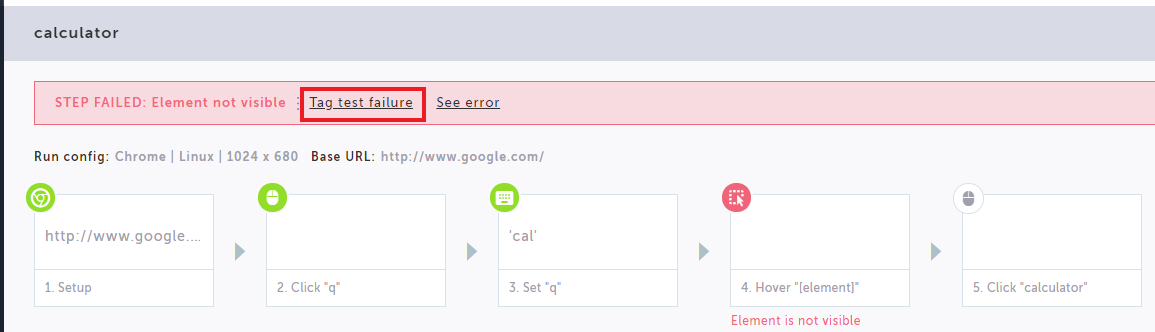On the test editor screen you will see your previously selected test failure tag.