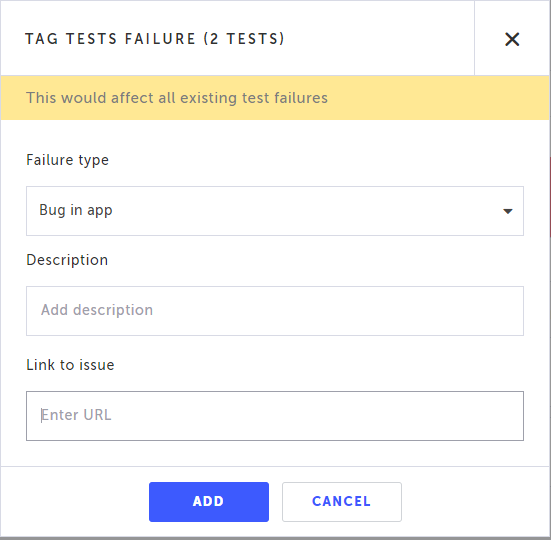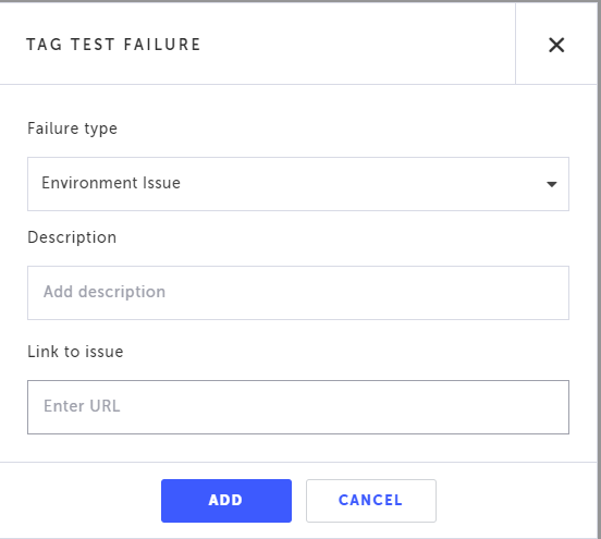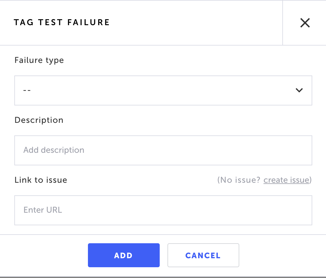 Select the Failure Type, add a description (optional) and Link to issue in your issue tracking system (e.g. Jira), by entering a URL of the issue.