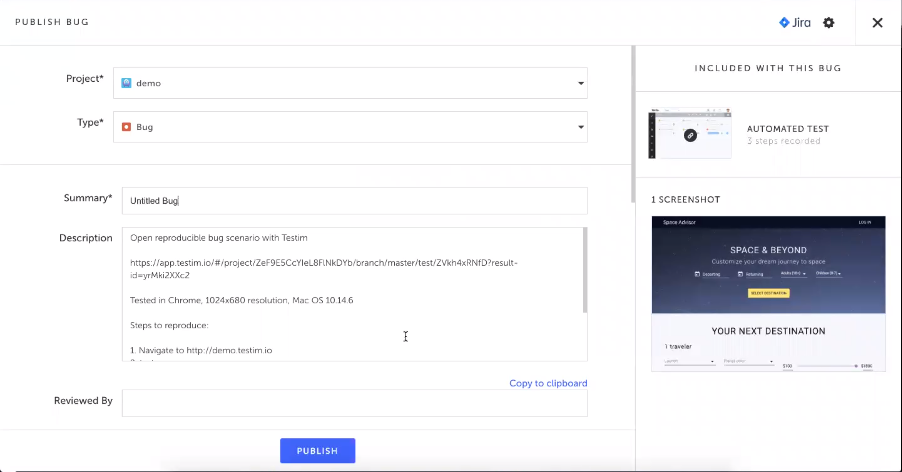 The bug details are automatically created and the Publish Bug screen is displayed:
