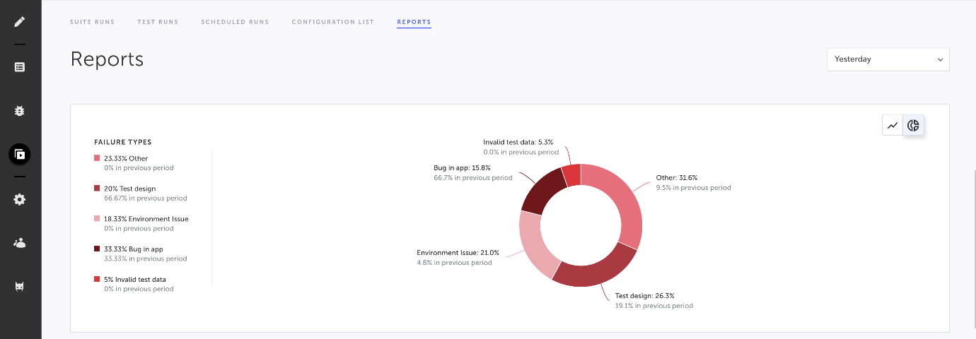 The donut chart displays the distribution of failure types by tag. Each tag includes the occurrence percentage out of the total number of runs and its percentage in the previous period. Clicking the failure tag takes you to the Test Runs screen, while listing all the runs that were tagged with this type.