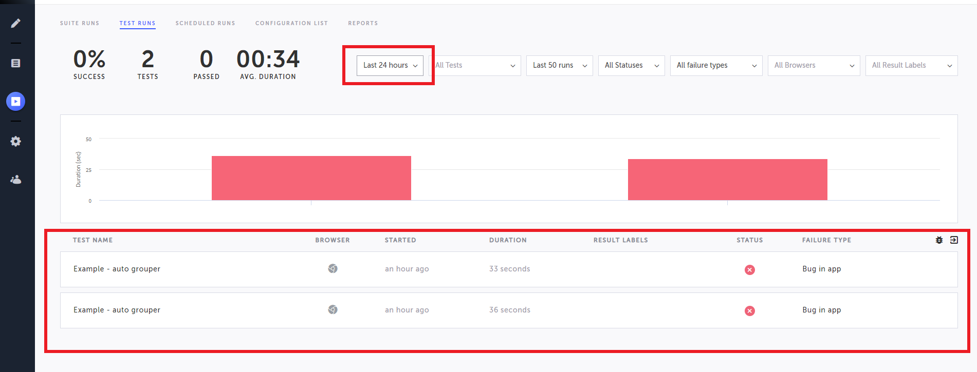 Creating a bug report for the failed test run