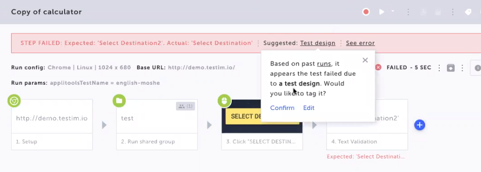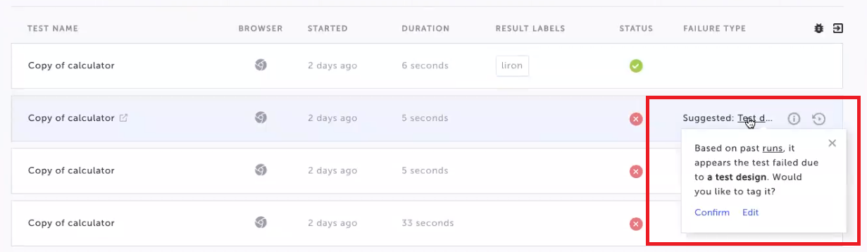 After tagging multiple failed tests, if Testim recognizes a reoccurring issue, it will suggest a failure tag based on your previous selections. The suggested failure tag appears at the top of the test result screen.