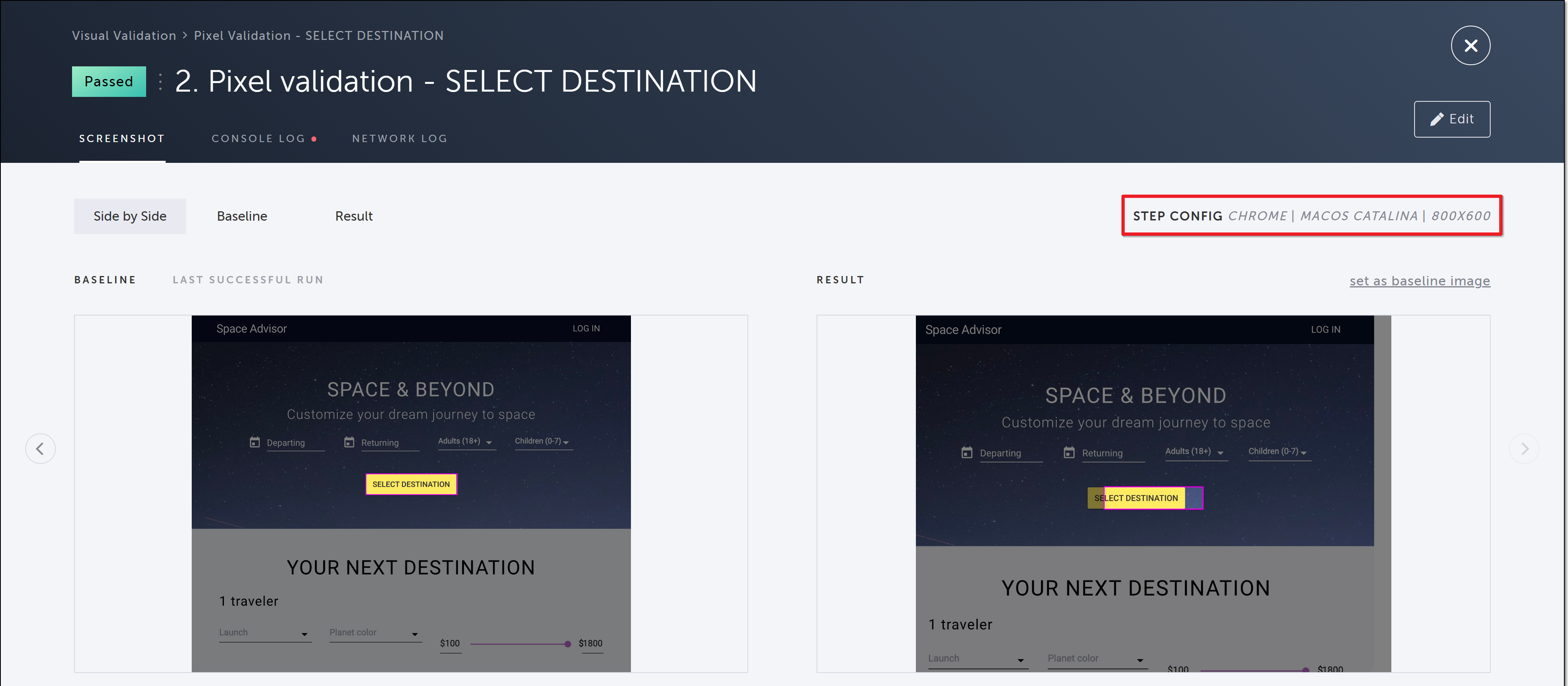 In visual validation steps that were run under multiple environments, when viewing the “Side by Side” view, the Step Config information on which the step was run is shown. For more information on test configuration, see Setting the Test Configuration.