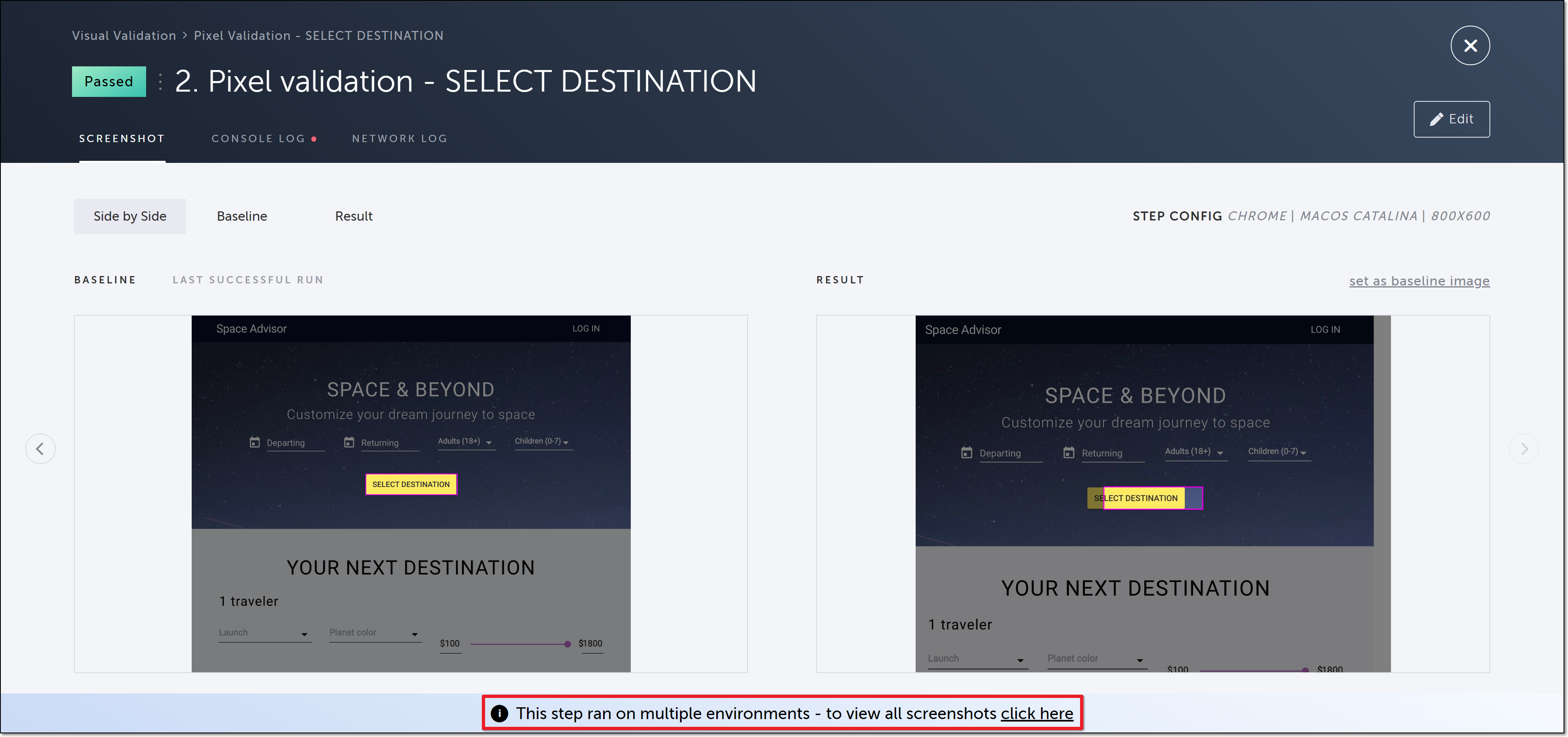 If the test includes visual validation steps which were run on more than one environment, the screenshots of these steps shown in the result are from the run on the main/initial environment, and a notification is shown on the bottom of the screen. → To view the screenshots from the runs on additional environments: